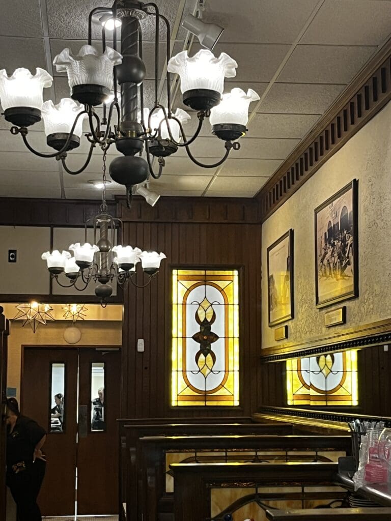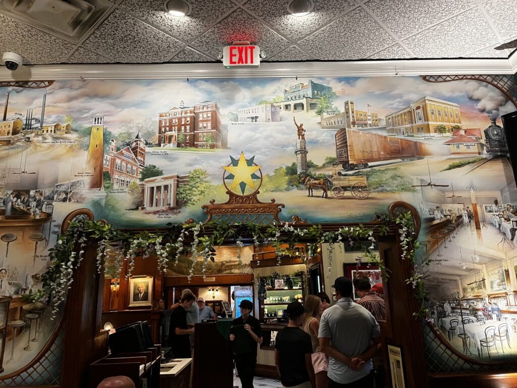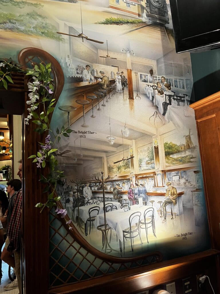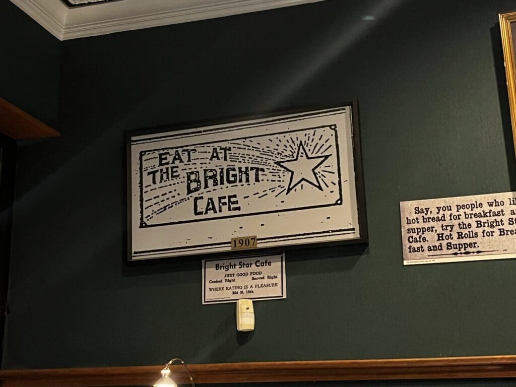 Part of what draws people to the Bright Star is the space itself. Murals depicting the city and the restaurant’s history cover large walls. The dining rooms feature dark wood paneling, stained and leaded glass, and framed memorabilia that hasn’t been styled to look old—it just is.